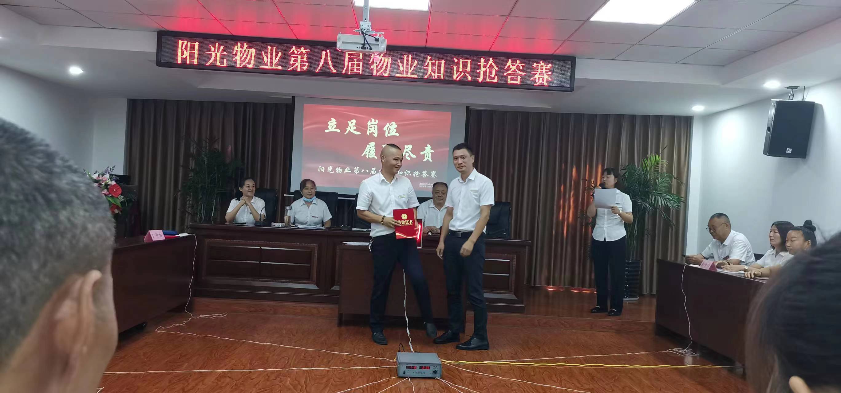 在大家共同的協(xié)調(diào)和配合下,陽光物業(yè)第八屆物業(yè)管理知識搶答賽取得圓滿成功?;顒蝇F(xiàn)場掌聲雷鳴,充滿了歡快熱鬧的氣氛,各參賽隊積極參與,主持人風(fēng)趣幽默,現(xiàn)場井然有序,笑聲不斷。比賽由必答題、搶答題、風(fēng)險題、觀眾答題四個環(huán)節(jié)組成。經(jīng)過一番激烈的競爭,最終由仙源保障房、廉租房組合的完美隊取得第一名,由廣德花苑、陽光鑫都組合的輝煌隊獲得第二名,總部和公園壹號組合的葵花隊取得了第三名,陳勇同志以答對9題的優(yōu)異成績脫穎而出獲得優(yōu)秀答辯手獎項。